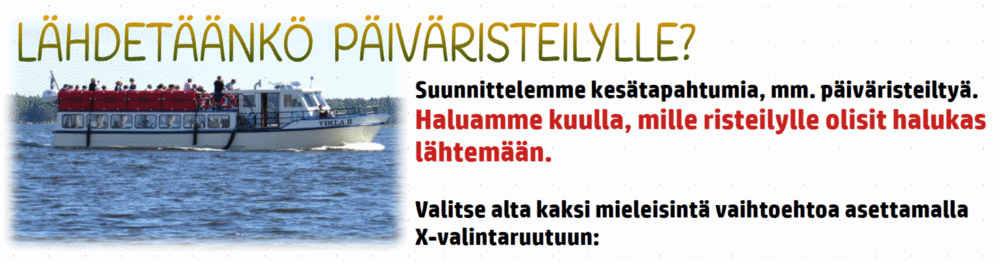 Yleisöristeily Tammion kalastajakylä 11.8.2026 klo 13–19 Vähintään 20 henkilön ryhmäristeily, sisältäen kuljetus Virojoelta Kotkaan ja laivalippu kuuden tunnin risteily. Hinta arv. 70 €/ henkilö.